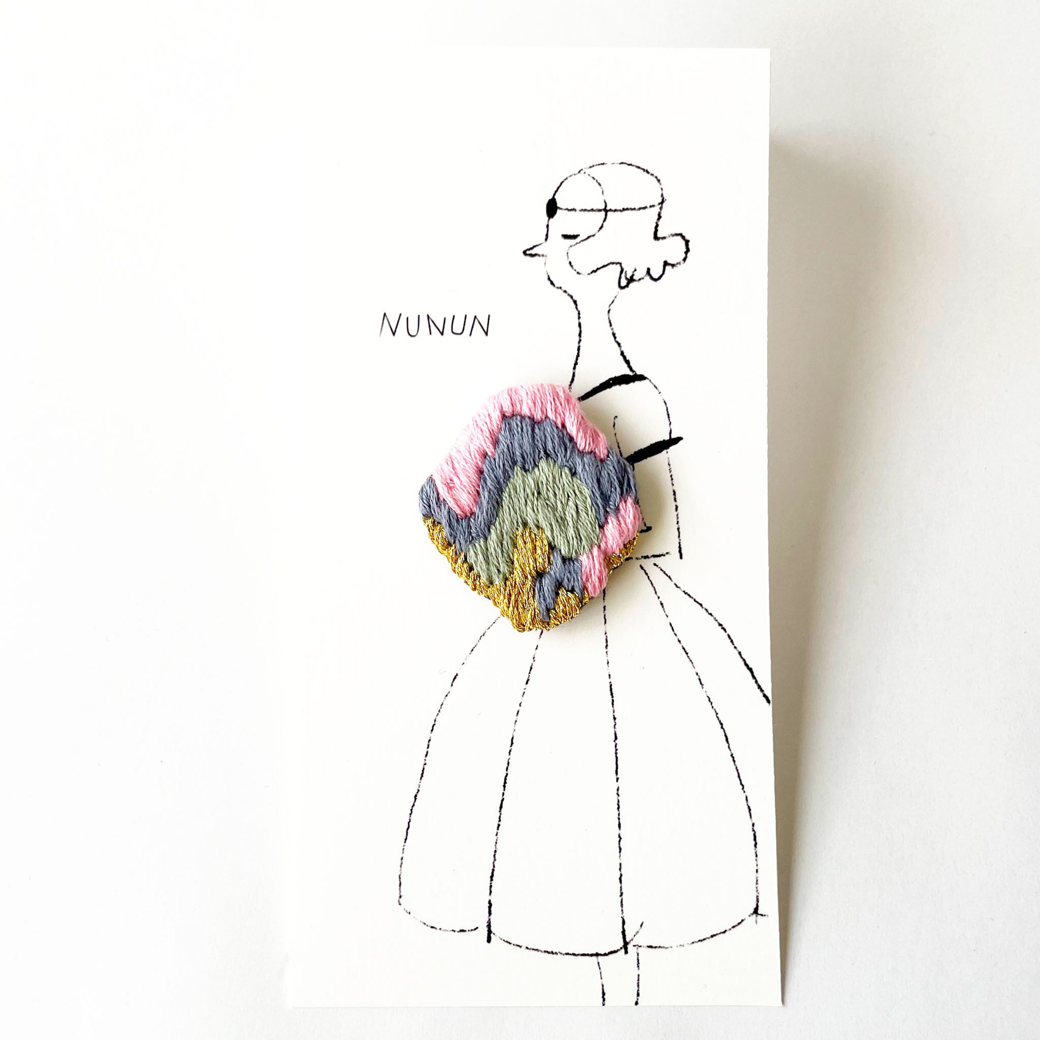 刺繍糸を使用した優しい色合いの一点。ゴールドの糸が物語への導入のようなスパイスになっています。軽いので耳への負担も少なく、下向き防止キャッチを使用しているので下に俯きません。